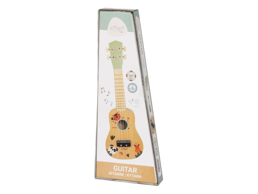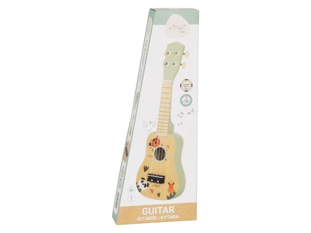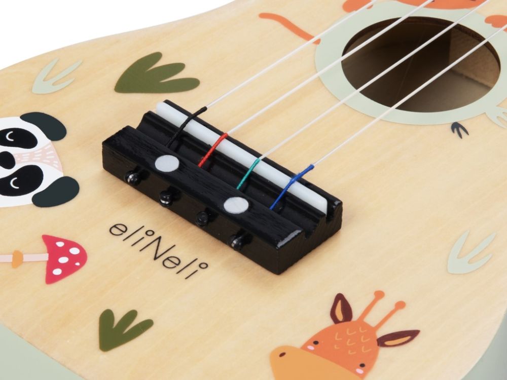 Chitara originală pentru copii (ukulele) cu animale drăguțe de la zoo, realizată din lemn natural, va lumina ochii fiecărei fete și băieți. Chitara pentru copii într-o schemă de culori neutre, într-o combinație de lemn și culori pastelate delicate, va trezi dragostea pentru muzică în fiecare copil. Acest popular instrument muzical pentru copii le va permite copiilor să joace rolul unor chitariști adevărați și să susțină un concert chiar în camera lor, pentru jucăriile preferate, prietenii și întreaga familie. Chitara pentru copii dezvoltă percepția auditivă, imaginația și creativitatea copiilor, abilitățile de comunicare, îmbunătățește abilitățile motorii, copiii joacă roluri, construiesc legături sociale.