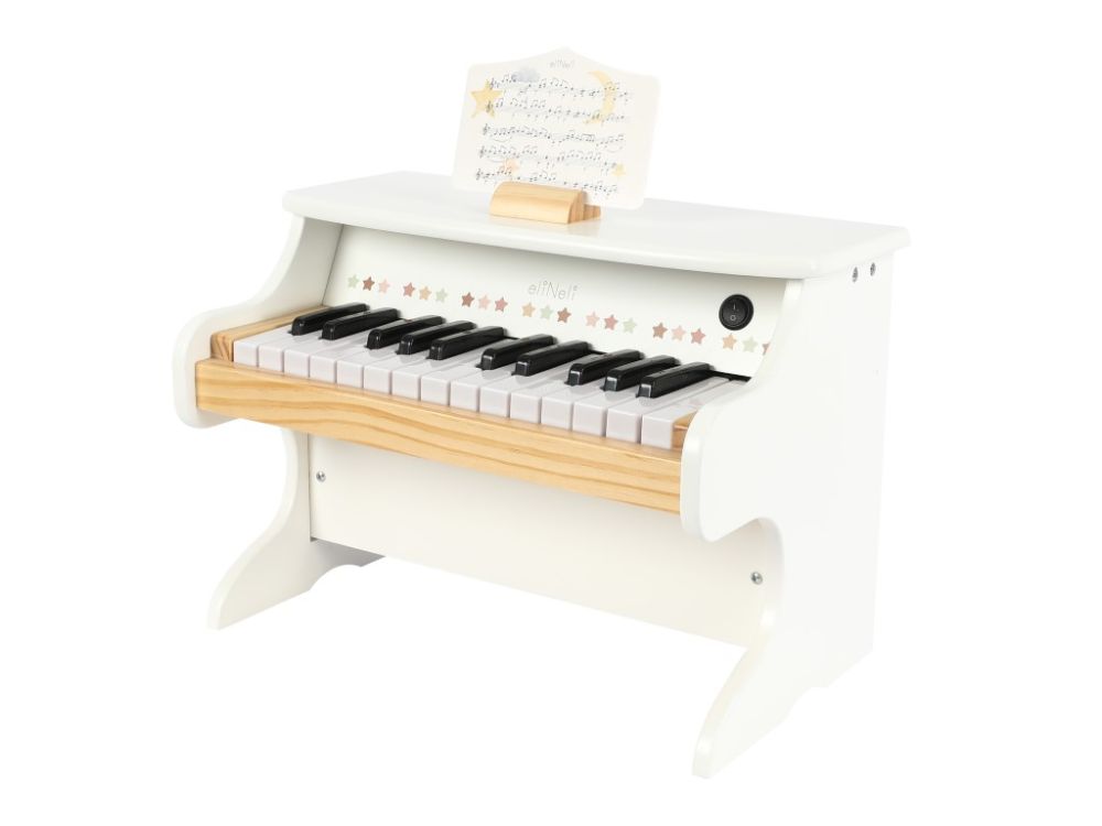O jucărie muzicală frumoasă și elegantă, sub forma unui pian mic (pian), va trezi interesul pentru muzică și va trezi dragostea pentru muzică în fiecare copil. Pianul, într-o combinație de culori neutre, alb cu lemn natural, este potrivit pentru orice interior (nu numai pentru copii). Pianul electric le va permite copiilor să joace rolul unui pianist profesionist. Pur și simplu apăsați comutatorul, atingeți ușor tastele pianului și acesta va începe să producă sunete frumoase. Invitați-vă la un concert de pian în camera fetiței sau băiețelului dvs. și bucurați-vă de această experiență unică. Poate că această jucărie muzicală va face ca copilul dvs. să iubească atât de mult să cânte la pian, încât va dori să continue să cânte chiar și la o vârstă mai înaintată. Pianul de concert pentru copii vine, de asemenea, cu un suport practic pentru partituri, pentru partiturile sau versurile melodiilor dvs. preferate.