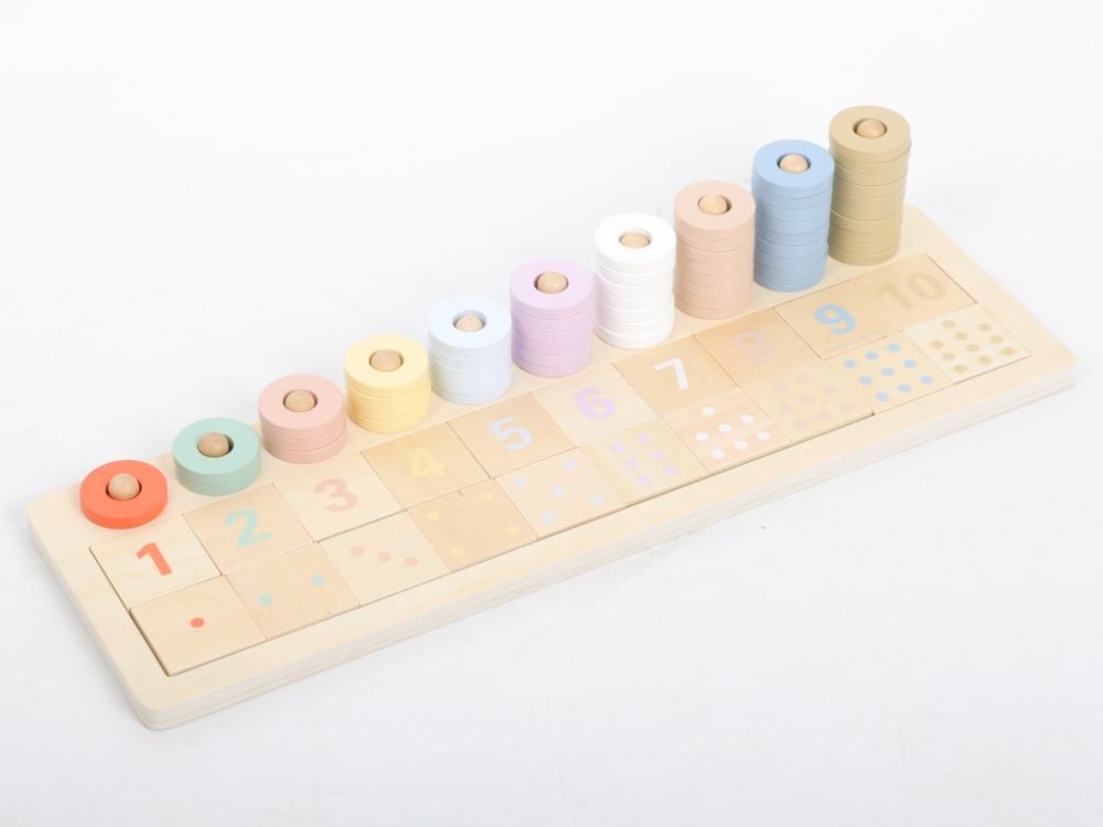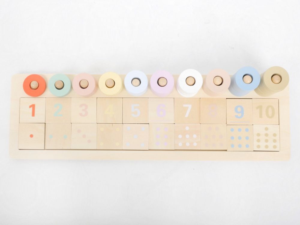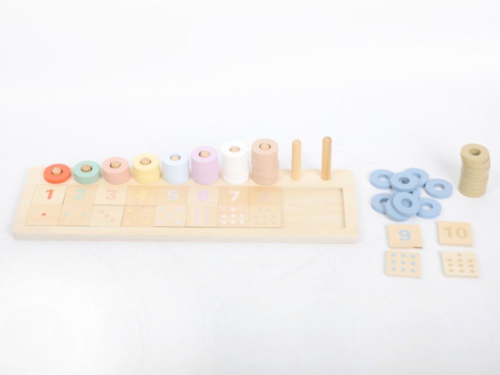Abacul Montessori din lemn cu piese detașabile este atât o jucărie, cât și un instrument educațional care îi inițiază pe copii în aritmetica de bază. Schema de culori este în conformitate cu pedagogia Montessori și respectă paleta de culori Montessori, care are o schemă de culori uniformă pentru diferite jucării și instrumente Montessori – unu este roșu, doi este verde, trei este roz etc. Copiii se vor juca cu abacul din lemn ca pe un joc de asamblare, un puzzle și, cel mai important, ca pe un abac practic care îi introduce în lumea numerelor, le demonstrează diferența dintre mai mult și mai puțin și îi ajută la scădere și adunare. Abacul va antrena abilitățile motorii fine, coordonarea ochi-mână, îi va învăța pe copii să recunoască culorile, numerele și să numere.
