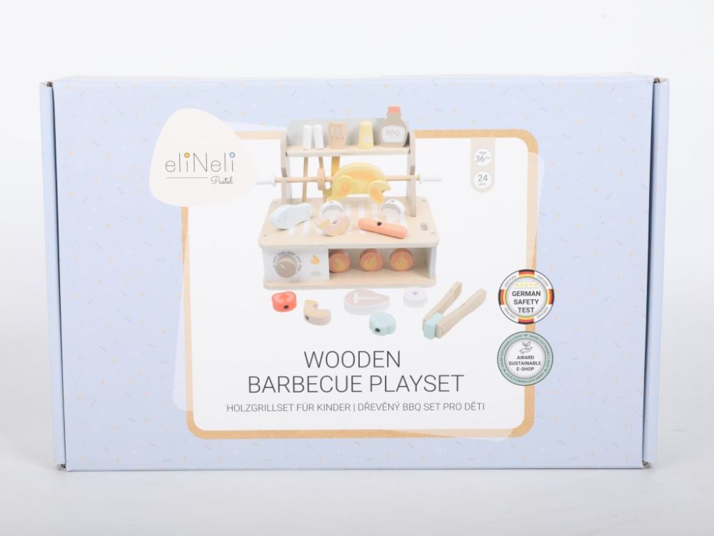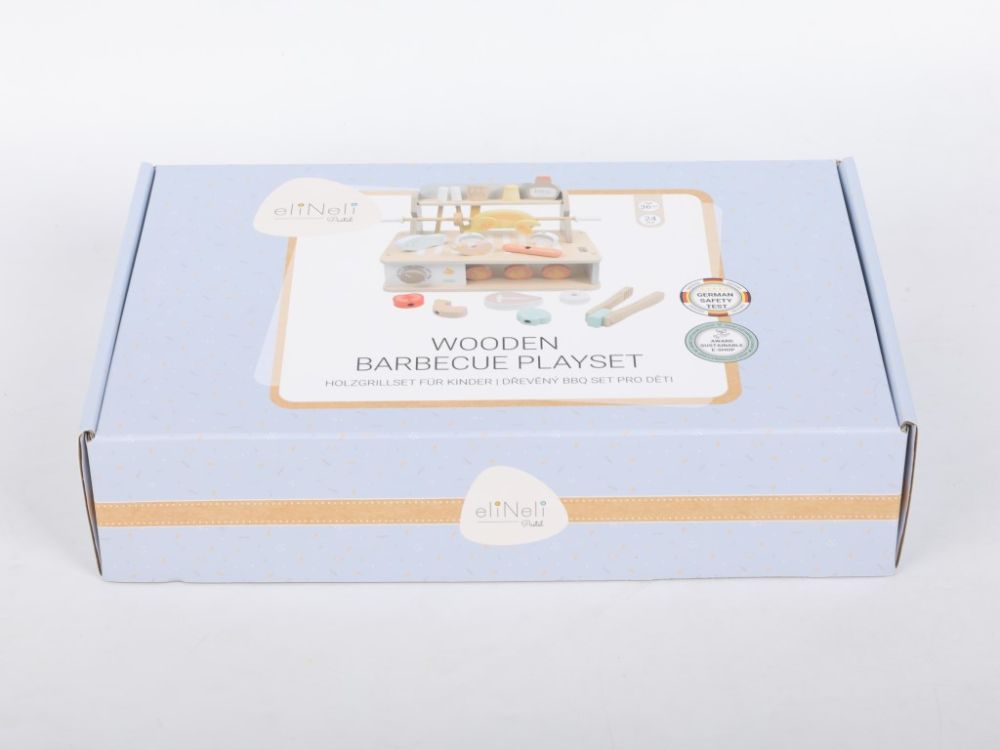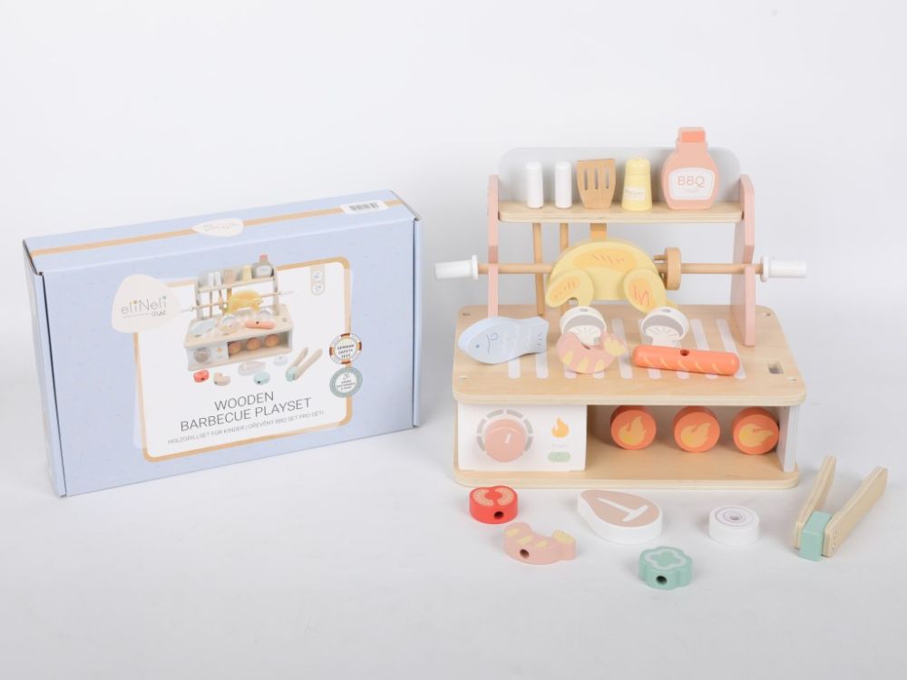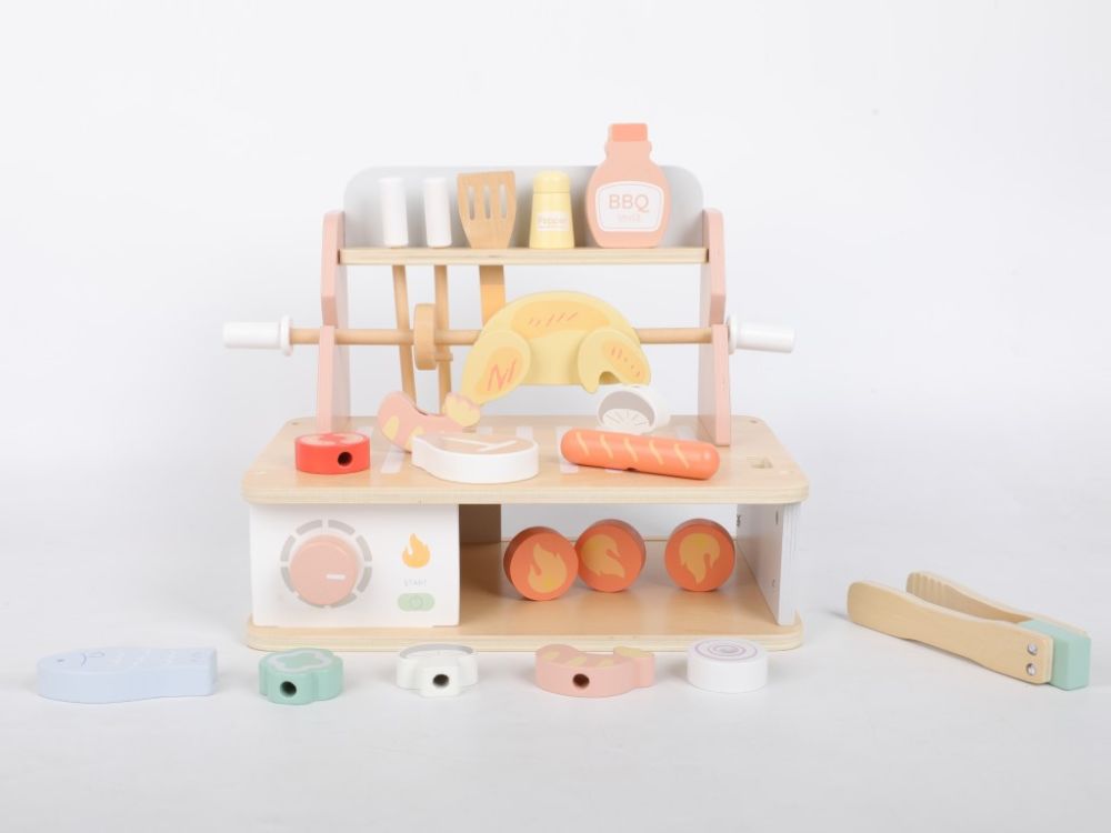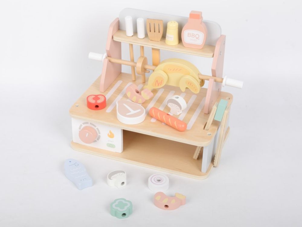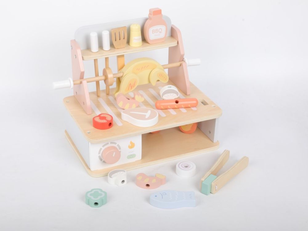 Un grătar din lemn cu o multitudine de accesorii permite copiilor să gătească la grătar și să organizeze festivaluri de barbecue pe tot parcursul anului, în orice condiții meteorologice, în liniște, chiar și în camera copiilor. Deși grătarul include flăcări, nu este nevoie să vă faceți griji cu privire la jucărie, deoarece acest grătar este din lemn și nu arde. Diferite tipuri de carne și alimente pot fi preparate în mai multe moduri pentru copii – pe grătar, la cuptor sau pe frigărui. Imaginația nu are limite, iar micul bucătar vă poate surprinde cu cât de creativ poate fi. Grătarul vine cu o varietate de ustensile pentru grătar și condimente. În timp ce se joacă cu grătarul din lemn, copiii vor încerca să gătească în siguranță, își vor îmbunătăți abilitățile motorii, dexteritatea manuală, își vor dezvolta imaginația și creativitatea, abilitățile de comunicare și jocul de rol.