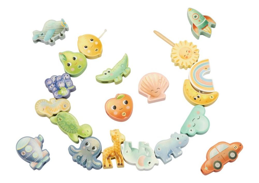 Conținutul pachetului Găleată, 20 de piese din lemn cu motive de animale, fructe, vehicule și obiecte din cer, 20 de cărți de joc puzzle, sfoară pentru înșirare