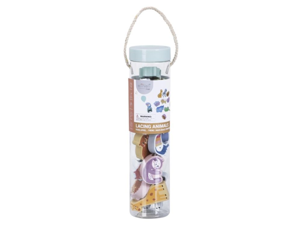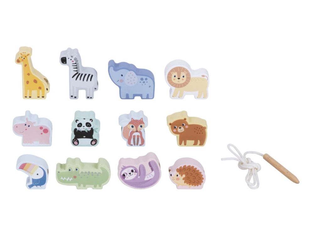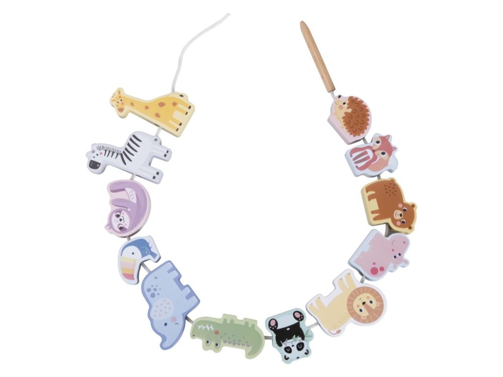 Jocul cu șnururi din lemn – înșirarea mărgelelor în formă de animale preferate de la grădina zoologică va ține mâinile și mintea copiilor ocupate. Animalele din lemn cu o gaură abia așteaptă ca copilul dumneavoastră să le înșire pe un șiret și să facă un colier original din ele. Fie că primul este un elefant sau o girafă, depinde doar de imaginația copilului, nu există limite pentru creativitate. Copiii se pot juca și singuri cu animalele din lemn de la zoo. Înșirând animalele din lemn pe șiret, copiii își vor antrena perfect degetele, își vor îmbunătăți abilitățile motorii fine, coordonarea ochi-mână și își vor dezvolta imaginația și creativitatea.
