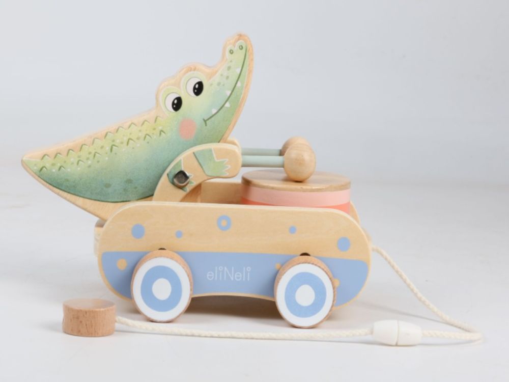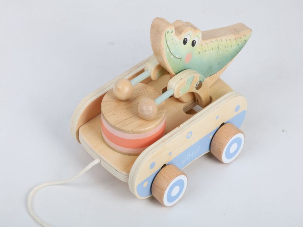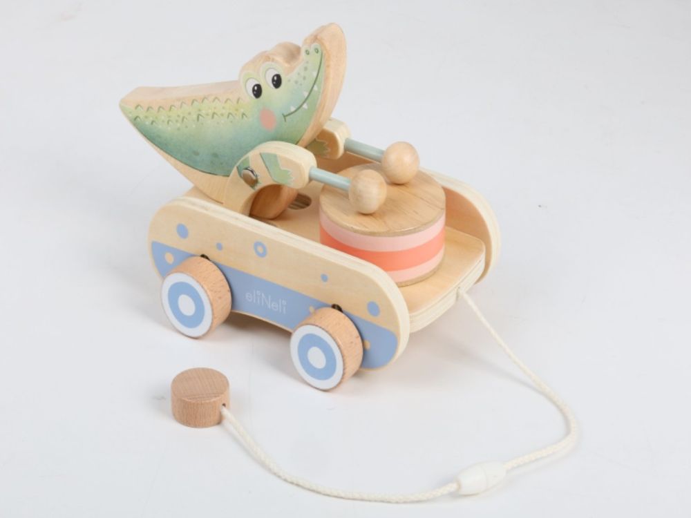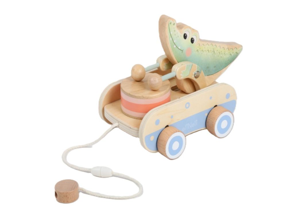 Jucăria de tras din lemn în formă de drăguț prieten crocodil va fi companionul preferat al copiilor în timpul primilor lor pași. Deja când se mișcă în genunchi, crocodilul îi va încuraja cu entuziasm pe copii să facă alte încercări. Pe măsură ce se mișcă, mâinile lui mici cu bețe de tobe sună împotriva tobei, creând un ritm vesel care stimulează curiozitatea și dezvoltă în mod natural sensibilitatea muzicală.
