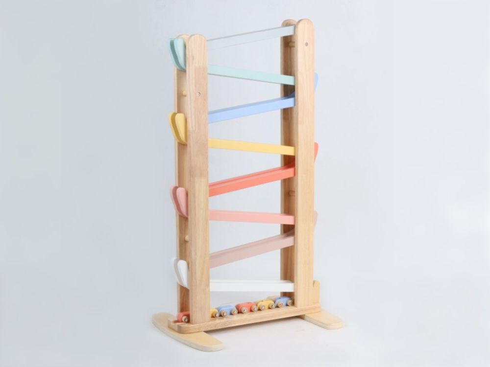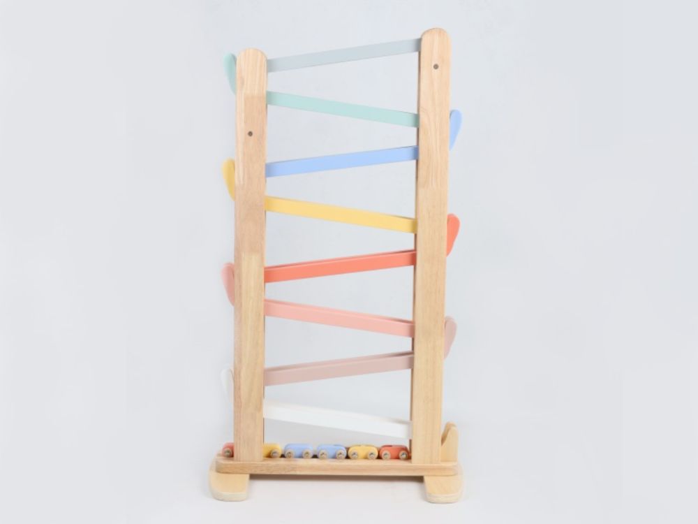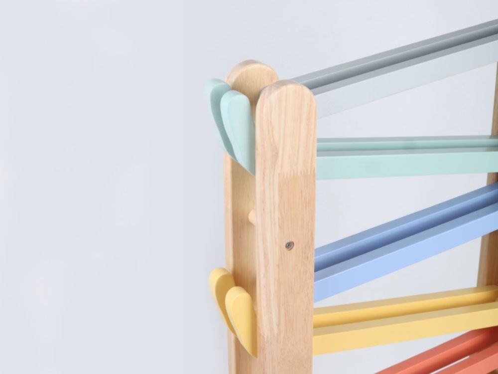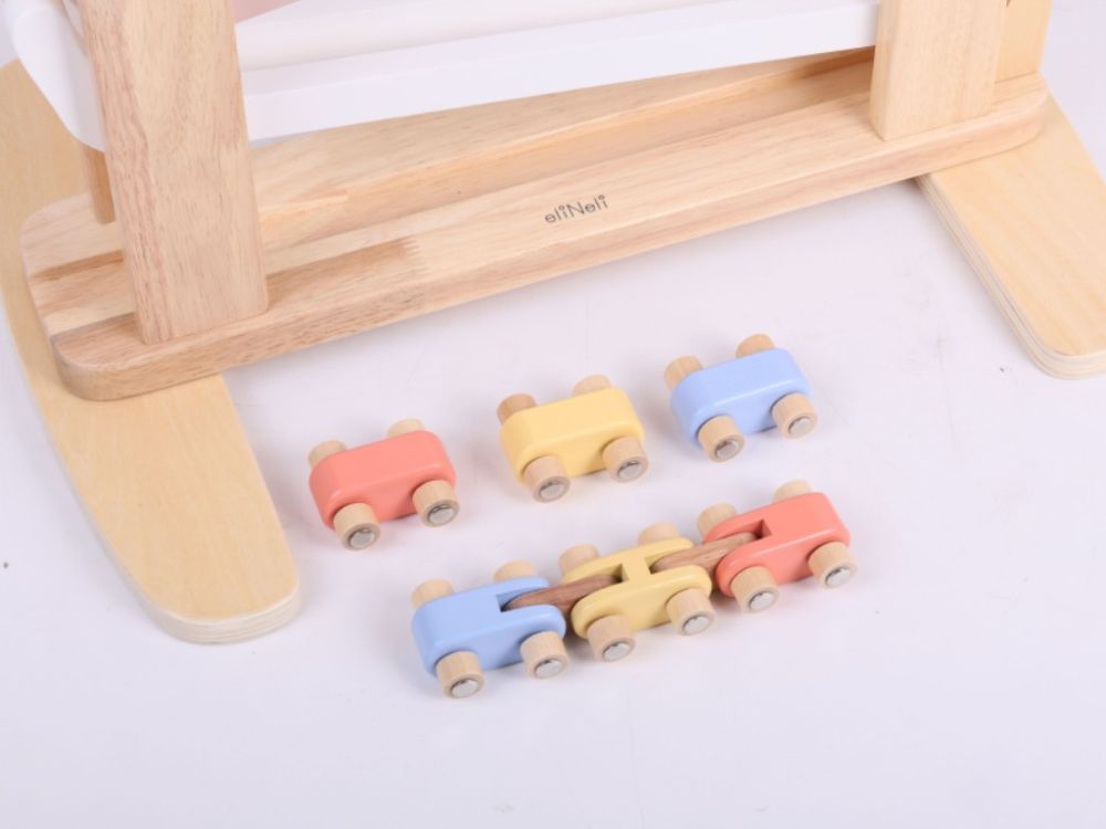 Versiunea XXL a pistei de curse din lemn va încânta micii piloți cu înălțimea sa suplimentară și culorile pastelate, care vor completa cu gust orice cameră de copii. Pista de curse cu tobogane colorate oferă o mulțime de opțiuni de joacă. Copiii pot lăsa mașinile individuale să alunece liber și lin, pot pune un set de 3 mașini conectate pe pistă ca un mini tren sau autobuz sau pot organiza curse pentru mașini. Pur și simplu așezați una dintre mașinile de curse corect la începutul pistei de curse și observați cât de repede traversează toate nivelurile inferioare până ajunge la linia de sosire.