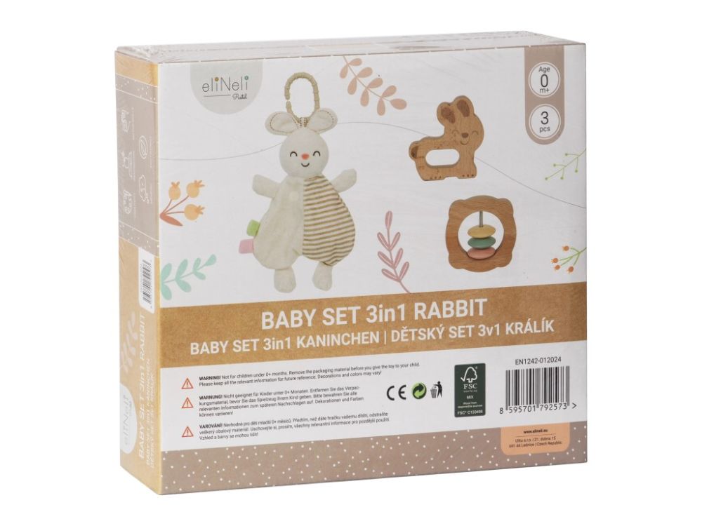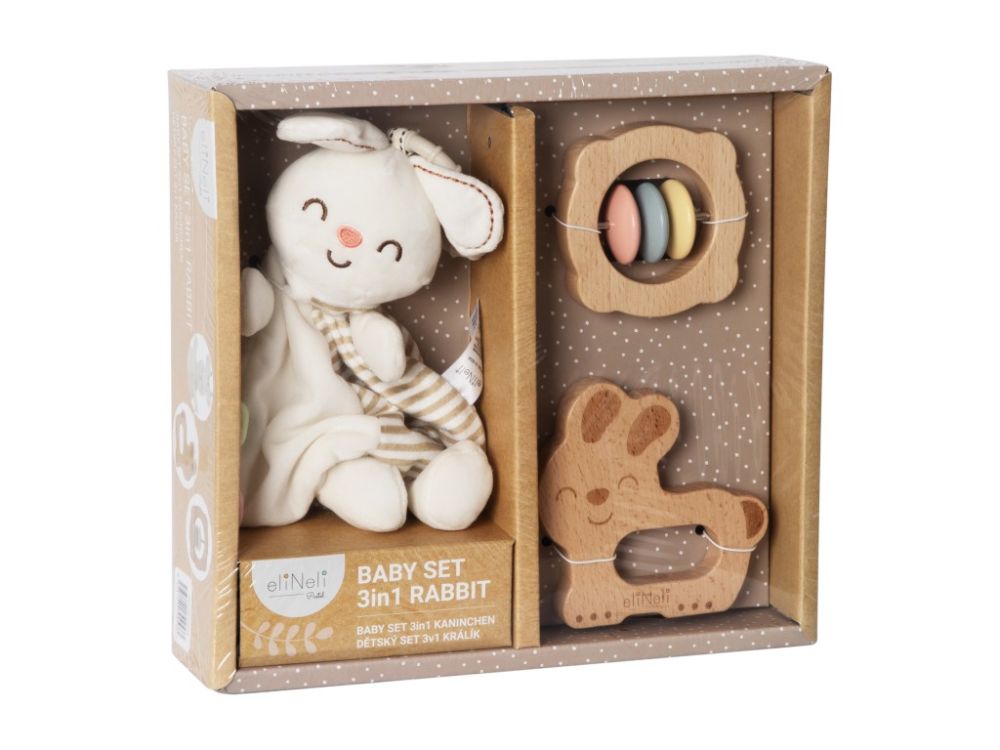 Setul cadou 3 în 1 pentru copii este un cadou minunat pentru bebeluși. Setul conține 3 jucării, potrivite pentru cei mai mici, care îi distrează și le îmbunătățesc abilitățile. Desigur, există o jucărie de pluș drăguță și moale (consolator) în formă de iepuraș, care ajută copiii să adoarmă în pătuț, leagăn, cărucior și scaun auto, care va fi un însoțitor fidel în timpul jocului și al explorării lumii din jurul lor. Zornăitoarea din lemn, cu sunetele sale, aduce un zâmbet pe fața bebelușului, stimulează simțurile și dezvoltă percepția auditivă. Setul include și o jucărie din lemn în formă de iepuraș, care se potrivește confortabil în mâna copilului, fiind modelată pentru o prindere și manipulare ușoară.