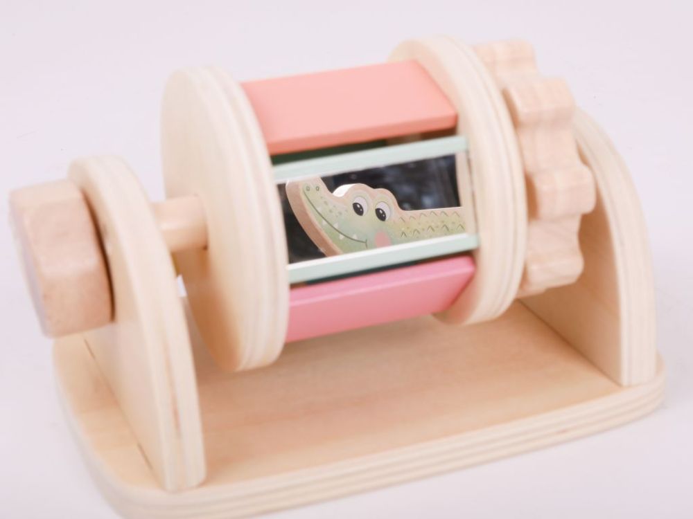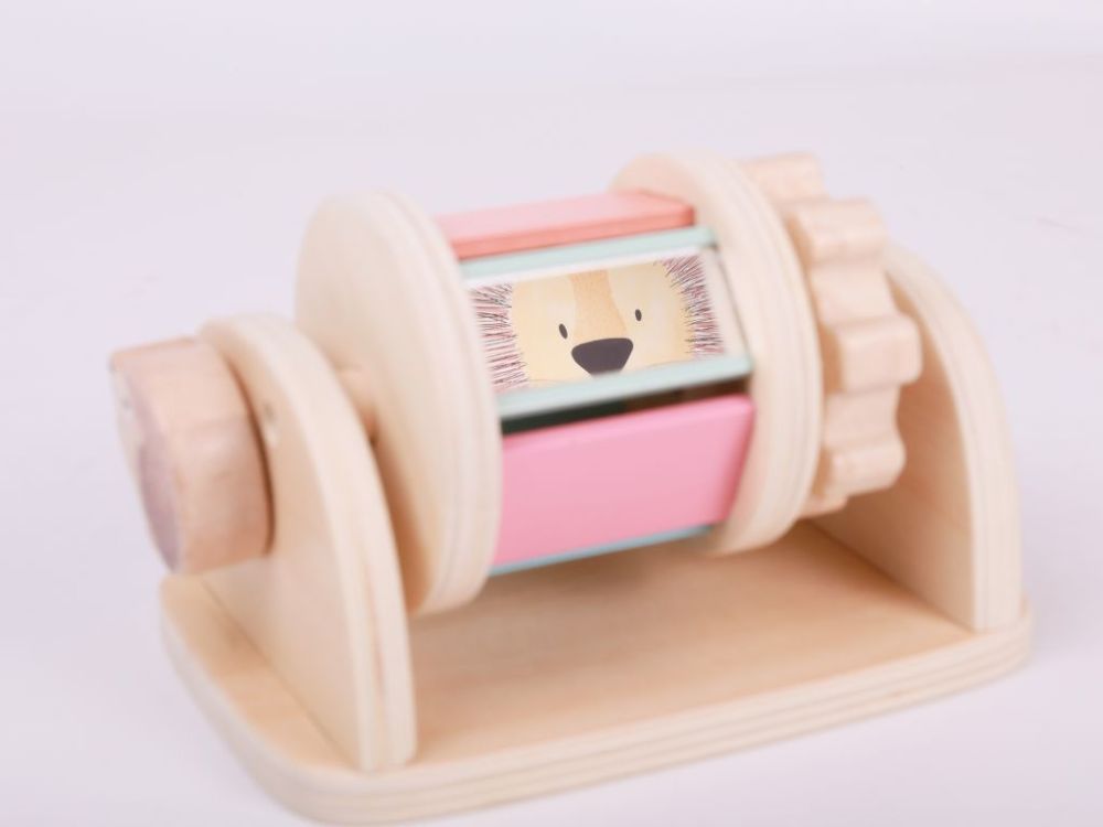 Toba senzorială din lemn pe un suport în culori delicate ale curcubeului încurajează explorarea. Pur și simplu rotiți-o și mingea din interior începe să scoată sunete care captivează copiii atât de mult încât nu vor mai lăsa jucăria din mâini.
