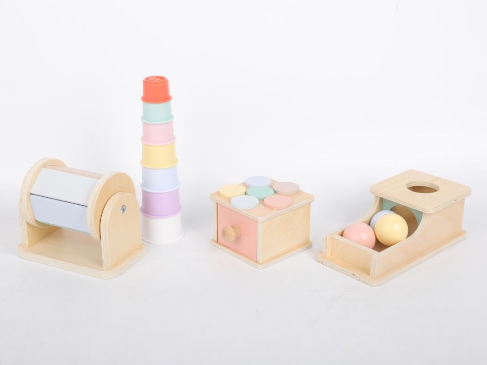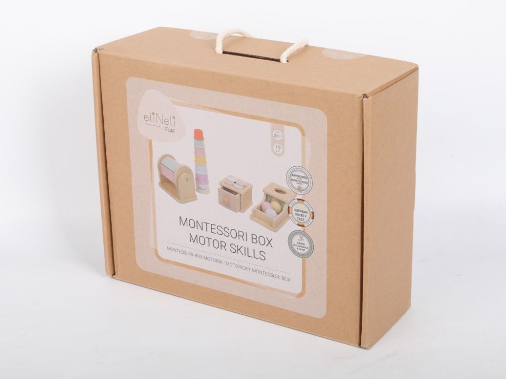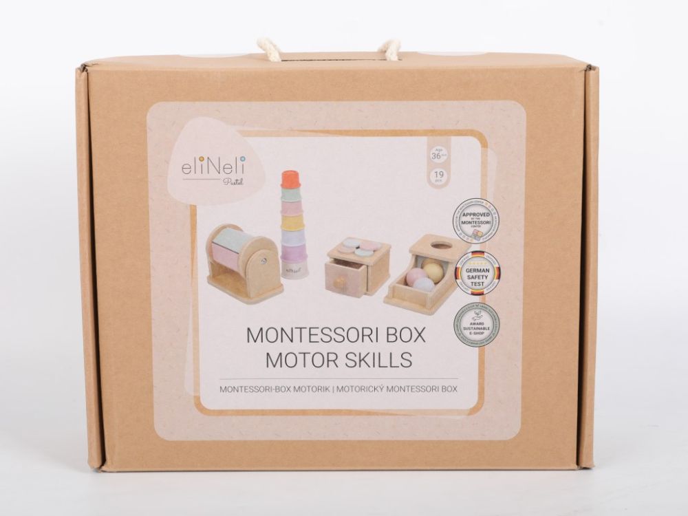 Setul de jucării motorii Montessori este un cadou ideal pentru copiii cu vârsta de peste 2 ani. Jucăriile selectate cu grijă sunt în conformitate cu pedagogia Montessori și susțin dezvoltarea naturală a copilului, ținând cont de nevoile sale. Setul de 4 jucării se concentrează în principal pe dezvoltarea abilităților motorii. În set, copiii vor găsi 3 jucării din lemn – un tambur rotativ, o cutie cu bile colorate și un joc de inserție cu roți colorate din lemn. Toate într-o combinație colorată de lemn natural cu culori pastelate delicate.