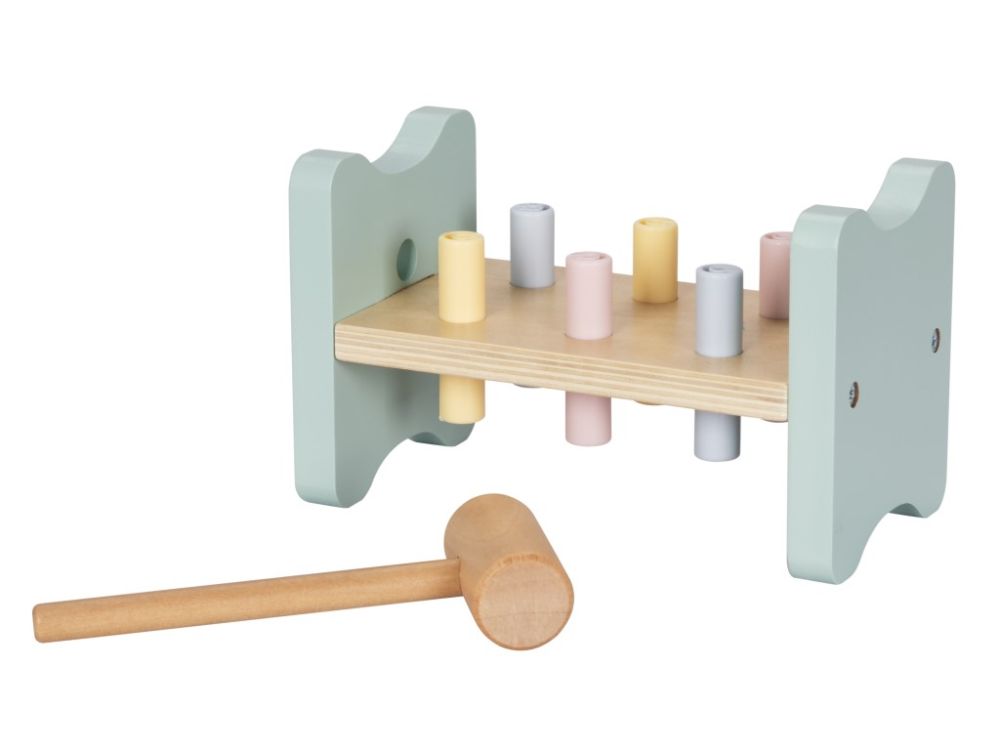 Ciocanul cu role în culori pastelate și un ciocan le permite copiilor să lovească rolele, să întoarcă ciocanul după lovire și să repete activitatea din cealaltă parte.