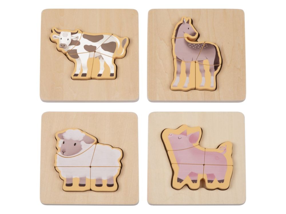 Un set de 4 puzzle-uri din lemn îi duce pe copii la fermă.