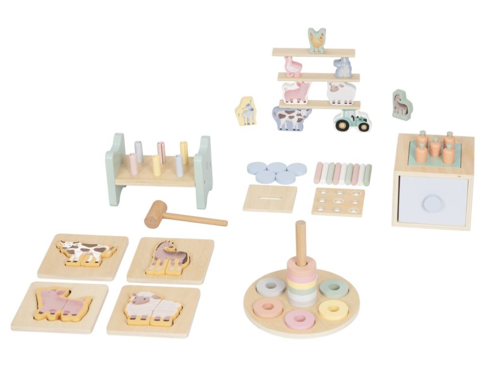 Cutia educațională conține: joc de echilibru fermă, jucărie educațională montessori (cutie) 3în1, joc de desfășurare – turn cu inele, ciocan pastel, set de puzzle-uri cu animale de fermă, descrierea jucăriilor și instrucțiuni pentru joc în cehă și engleză.
