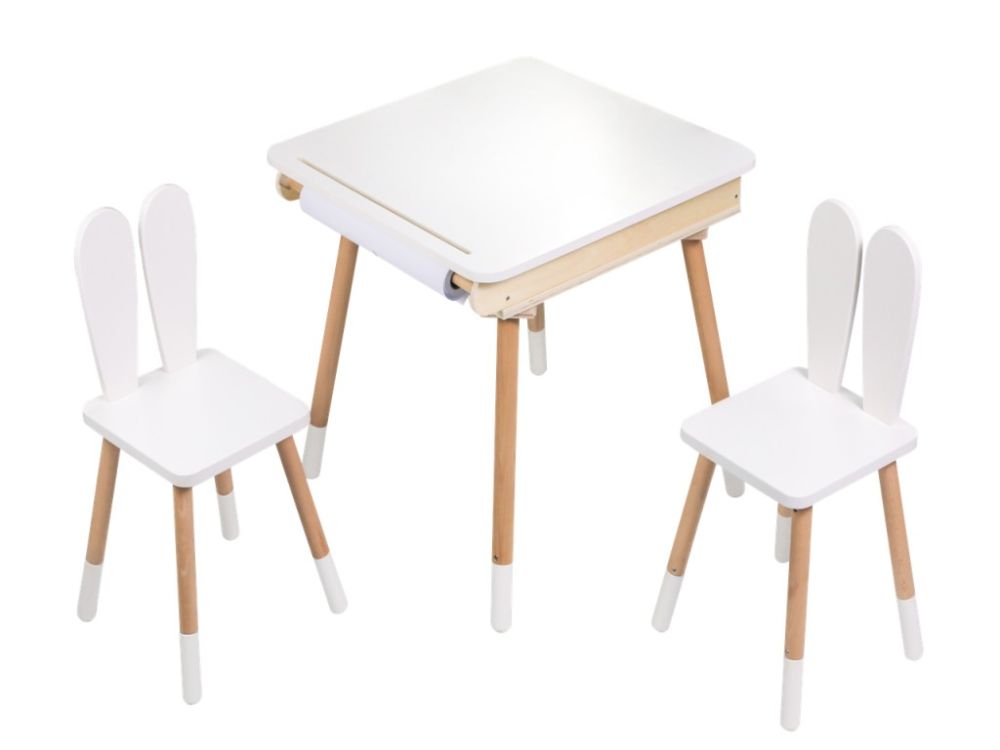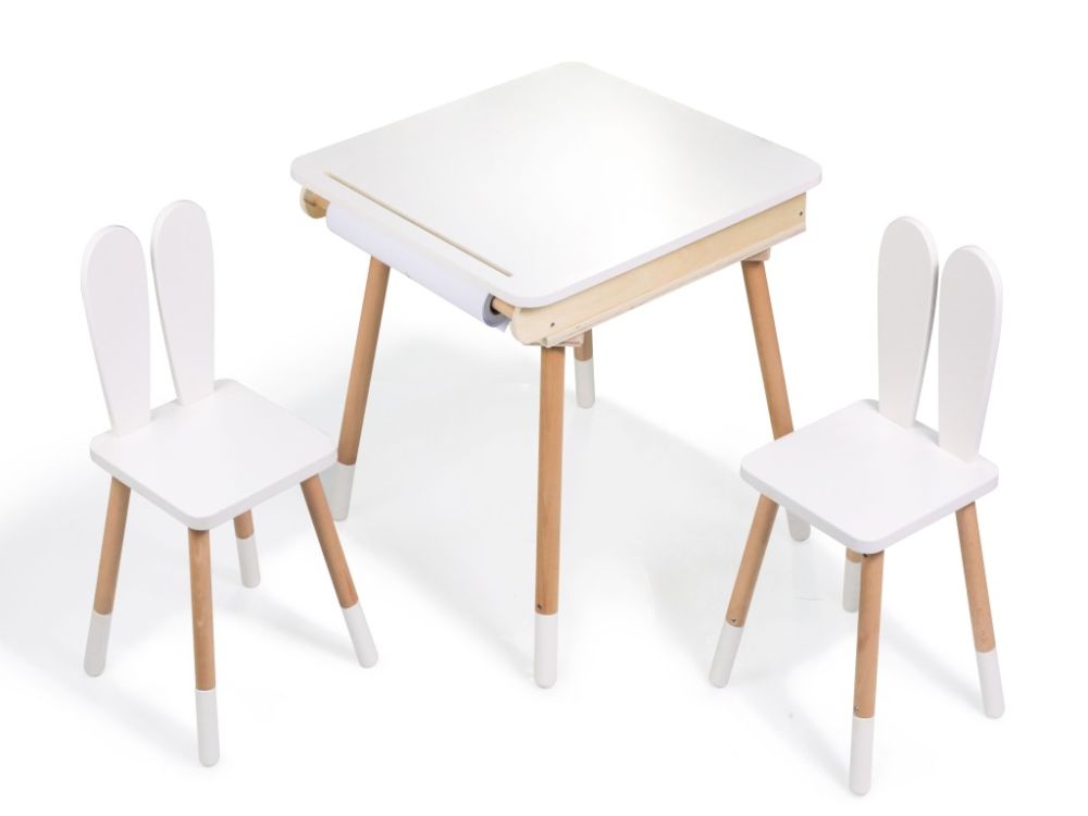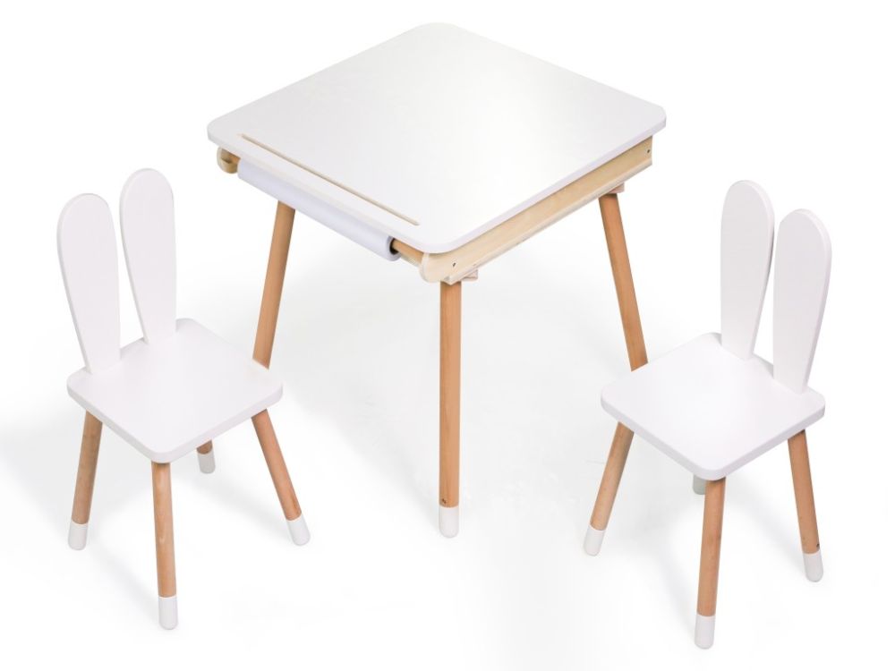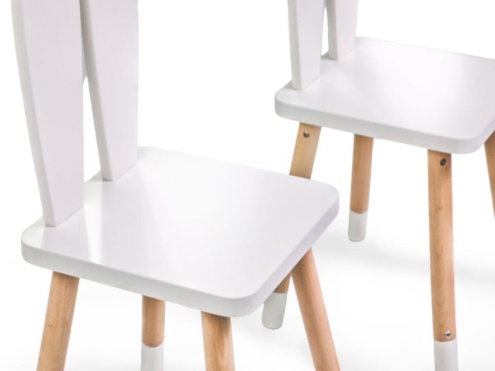 Mobilierul este realizat din lemn natural de fag de înaltă calitate, combinat cu culoarea albă, ceea ce adaugă interiorului un aspect moale și elegant. Designul atemporal al urechilor de iepure se va potrivi nu doar într-o cameră de copil, ci și într-o cameră de joacă, într-un birou sau într-un living. Construcția stabilă și finisajul sigur garantează o utilizare confortabilă și sigură.