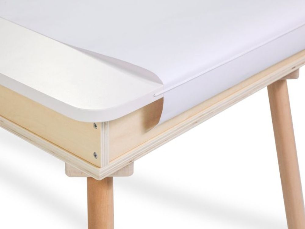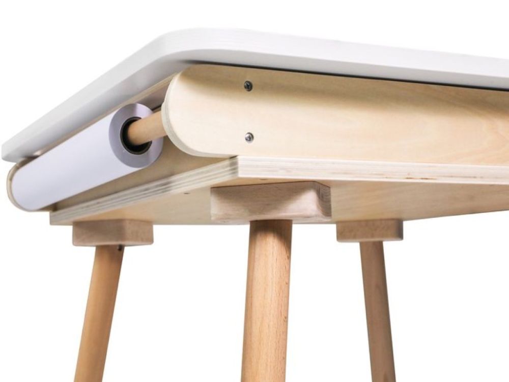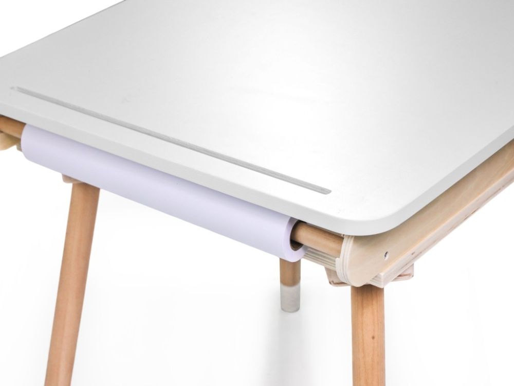 Copiii vor aprecia spațiul de depozitare practic ascuns sub blatul mesei. Trei compartimente pot depozita creioane, caiete, materiale de artă și un sul de hârtie de desen care se atașează ușor pe lateralul mesei. Pur și simplu împingeți hârtia prin gaura din masă, fixați-o cu elasticul de pe cealaltă parte și băieții și fetele pot desena cu bucurie imagini drăguțe.