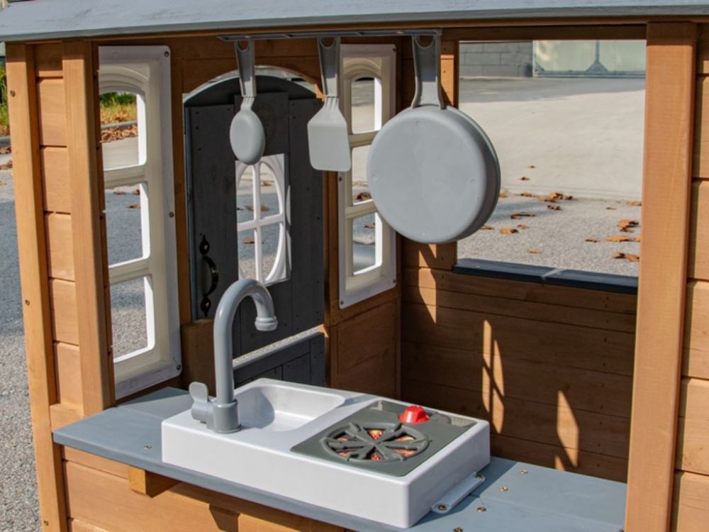 Căsuța încurajează jocul interactiv și imaginativ prin detalii bine gândite. Copiii pot folosi bucătăria de joacă integrată cu ustensile pentru a simula gătitul sau activitățile de zi cu zi.