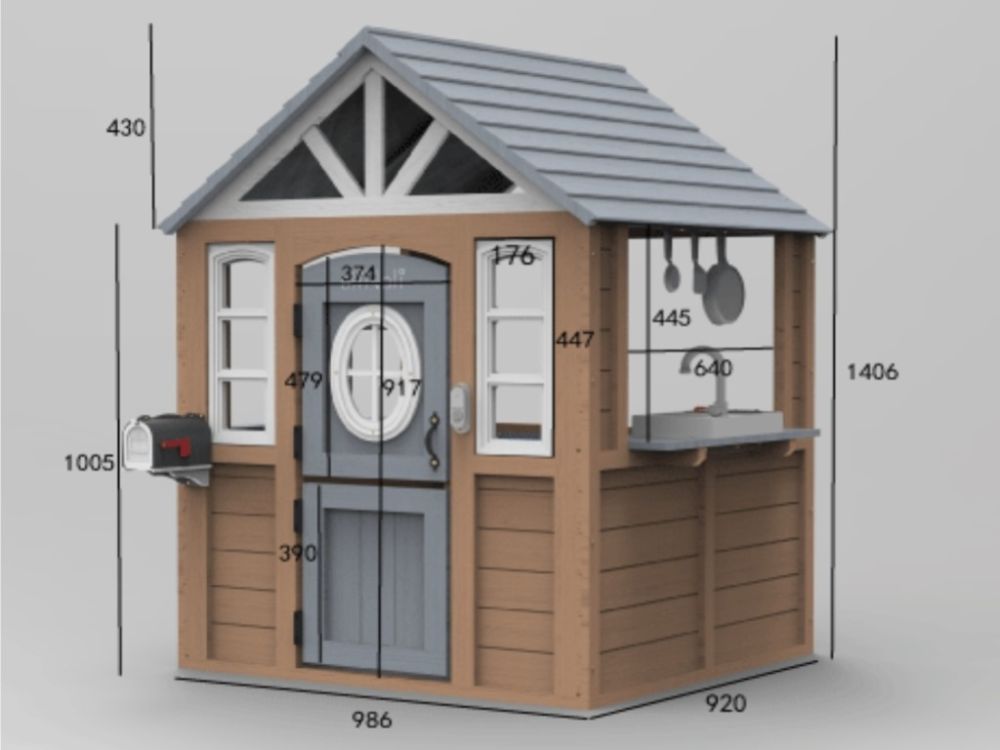 Dimensiunile exacte ale căsuței sunt 140,6 x 98,6 x 92 cm, oferind restul spațiului pentru joacă.