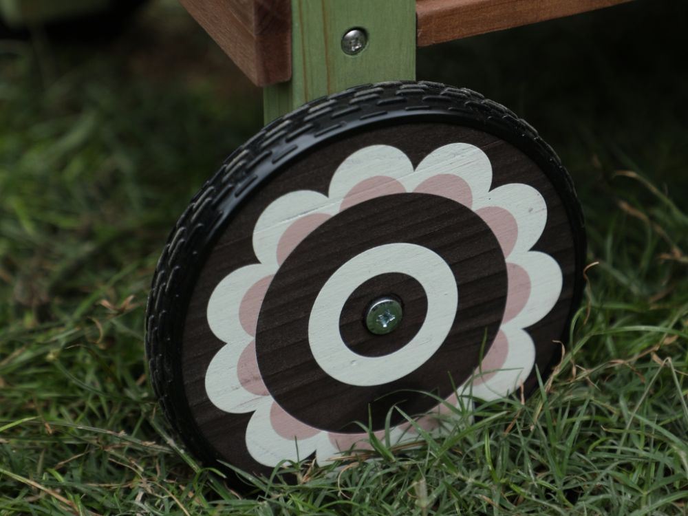 Datorită roților, chioșcul poate fi mutat cu ușurință prin grădină, astfel încât copiii să aibă de fiecare dată un mediu de joacă nou.