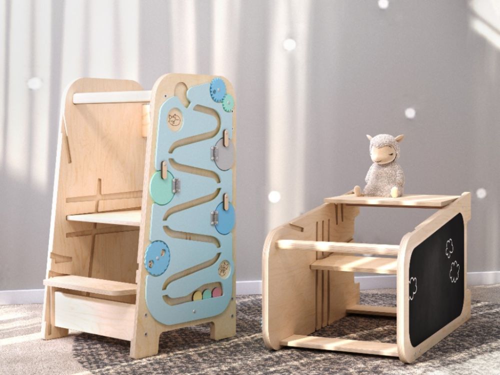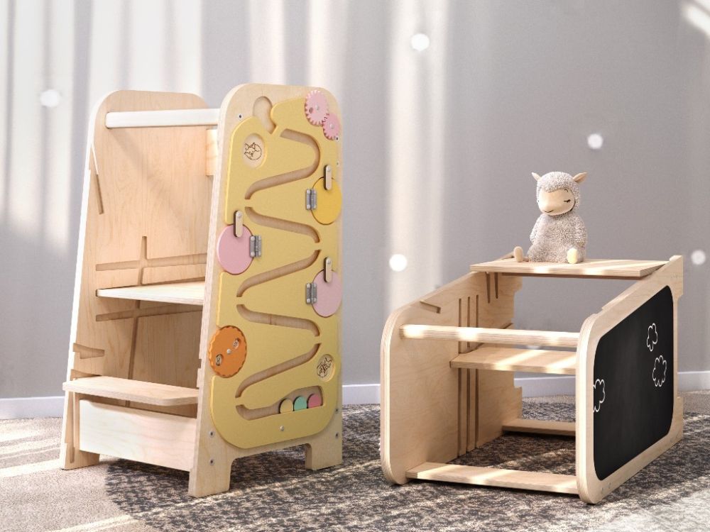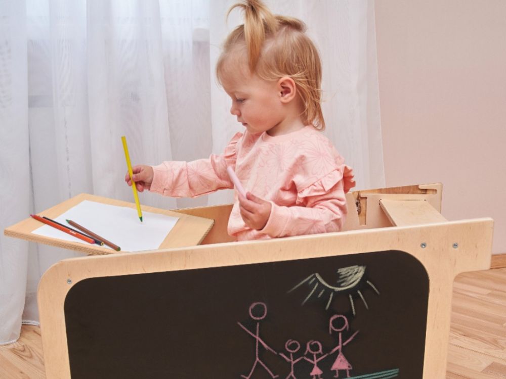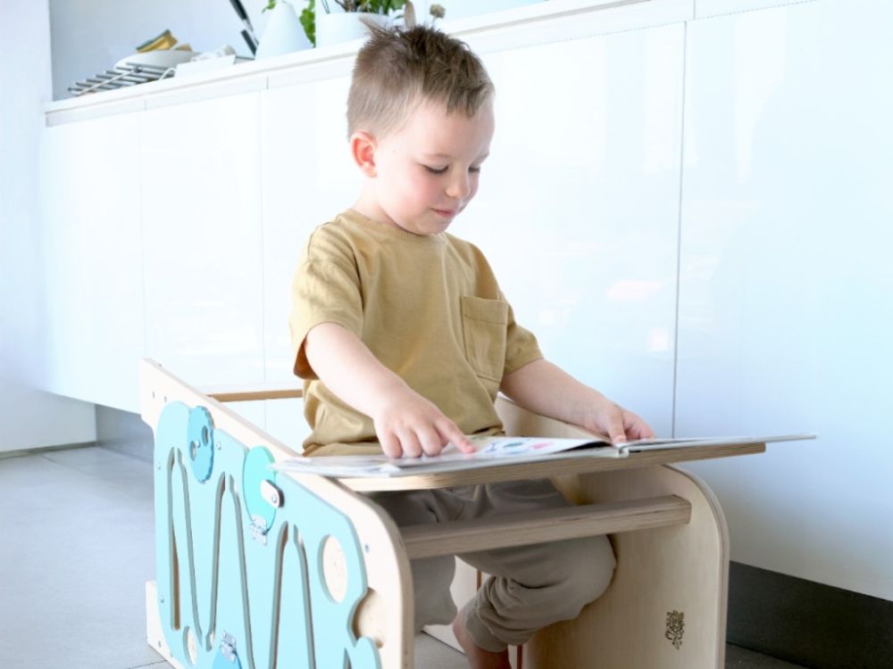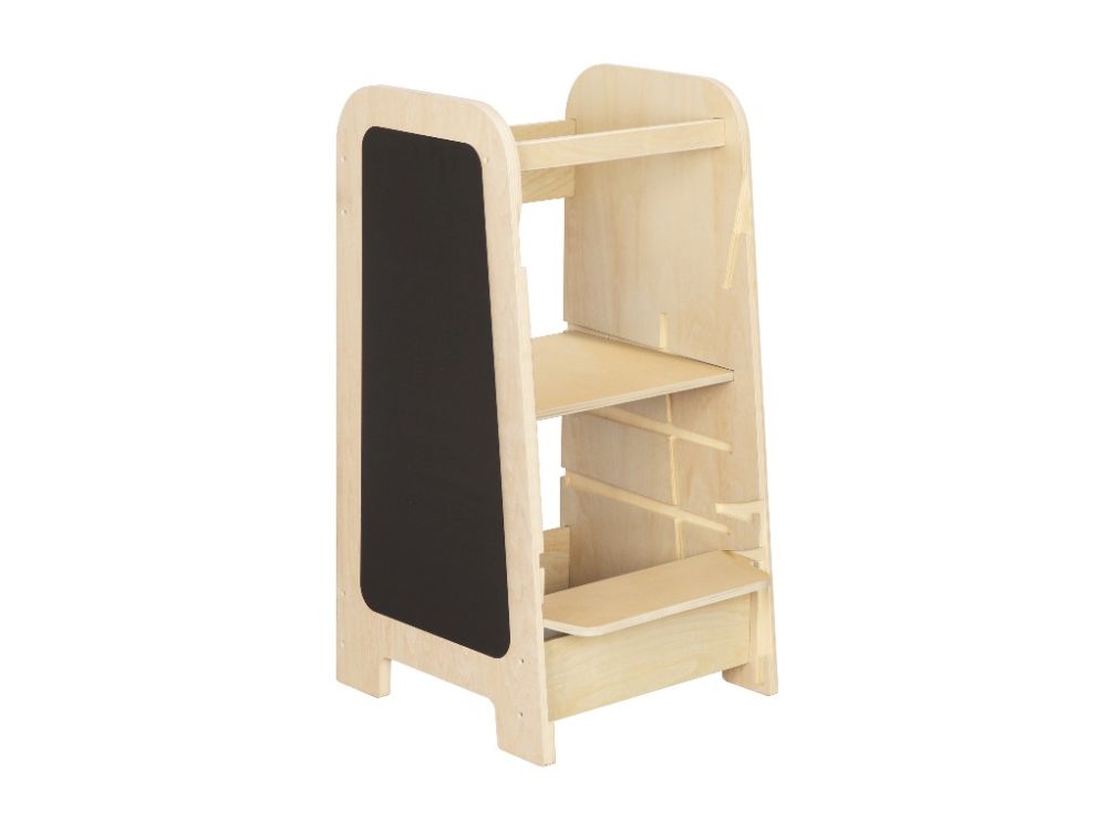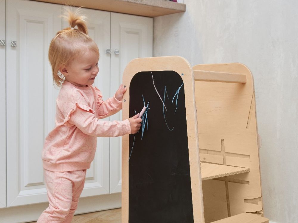 Prin așezarea Turnului de Învățare Play pe spate, ajutorul de bucătărie se transformă într-un set original de mobilier pentru copii – o măsuță și o băncuță (scaun înalt).