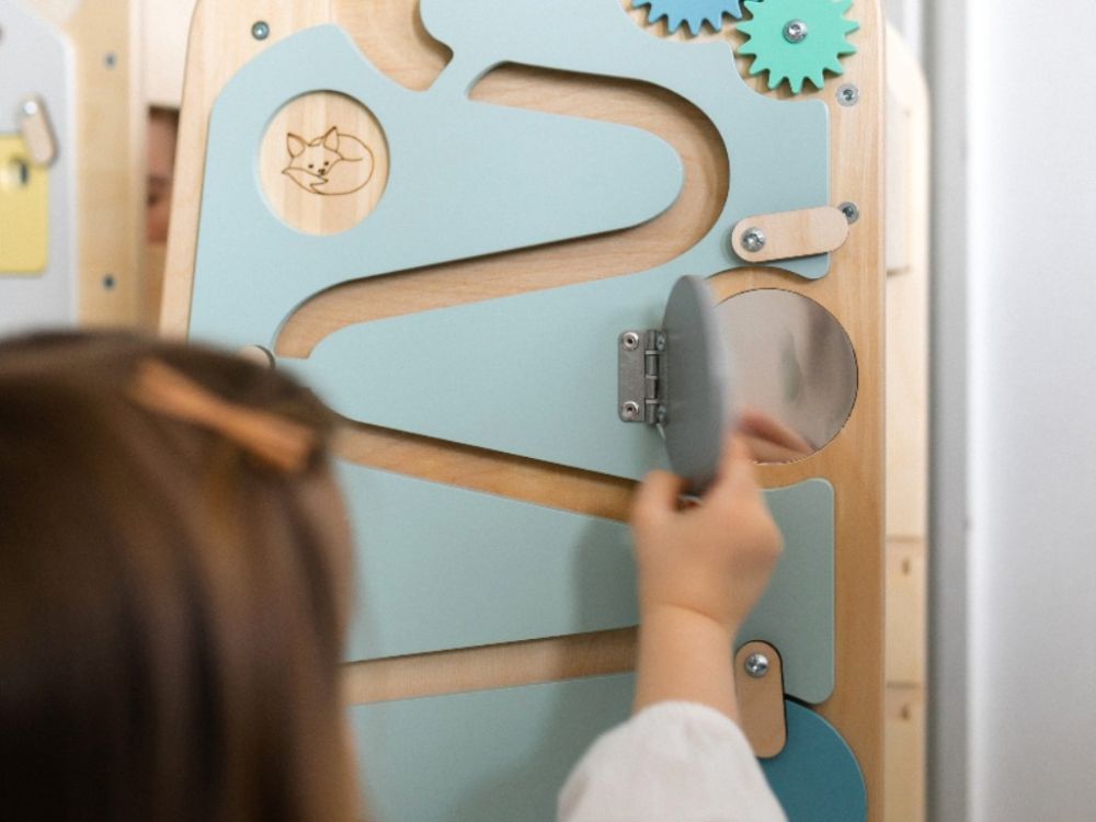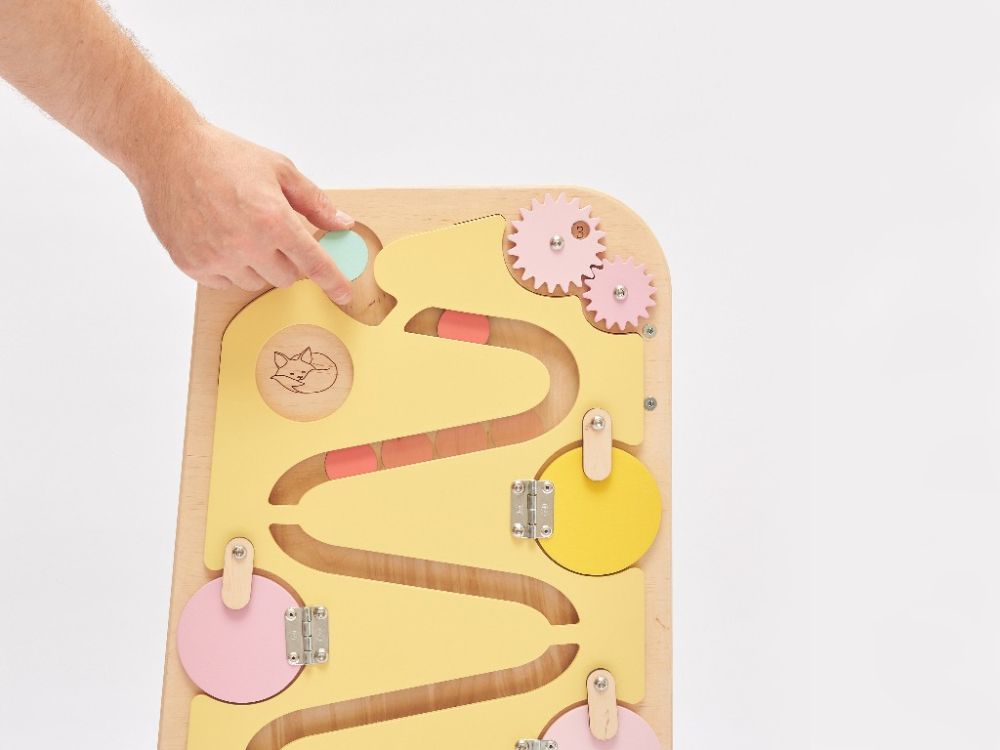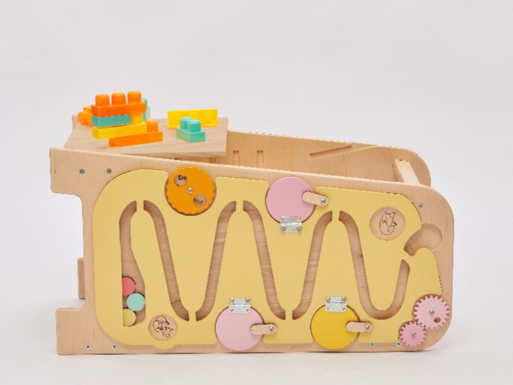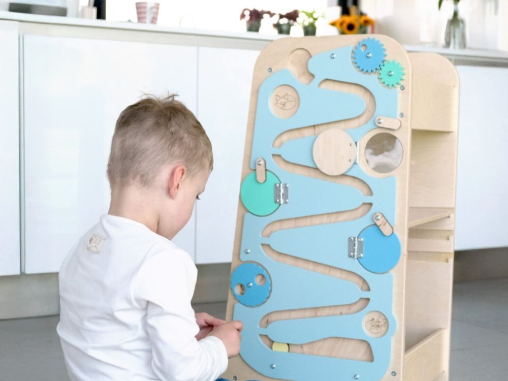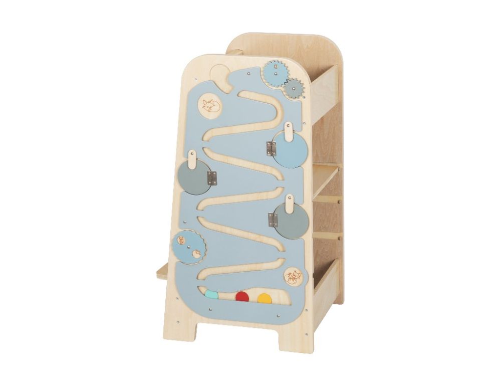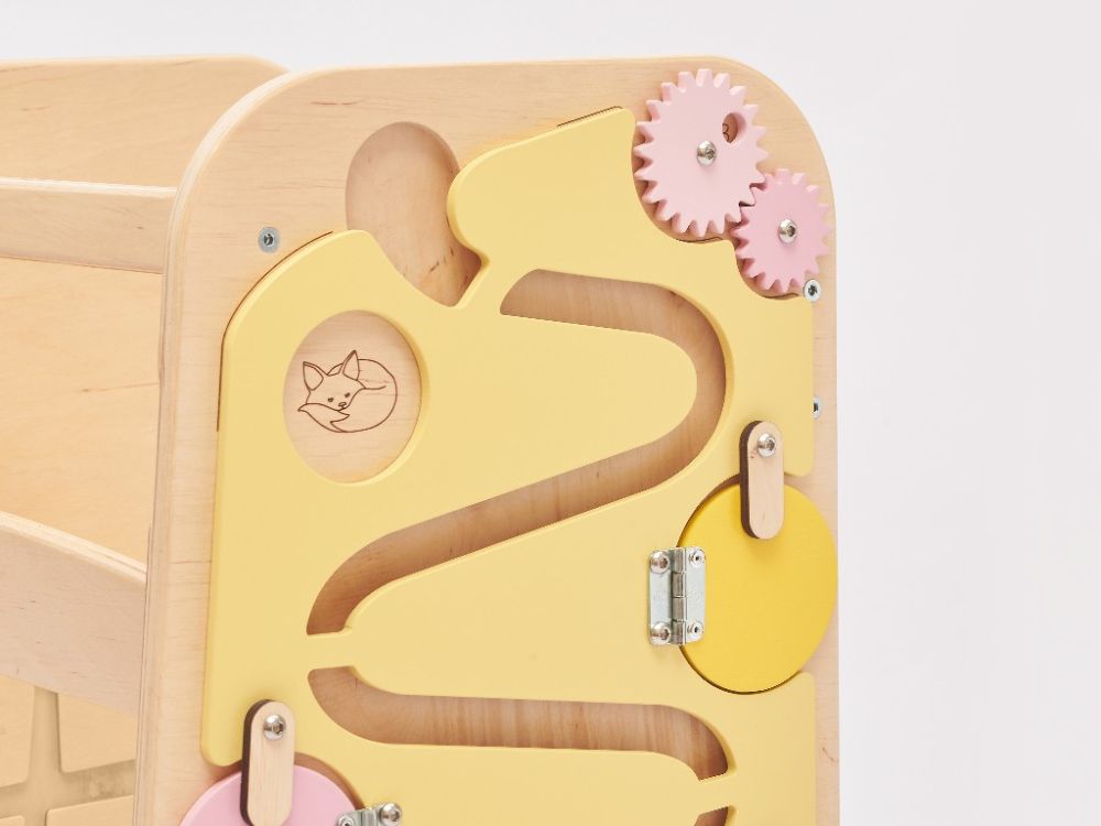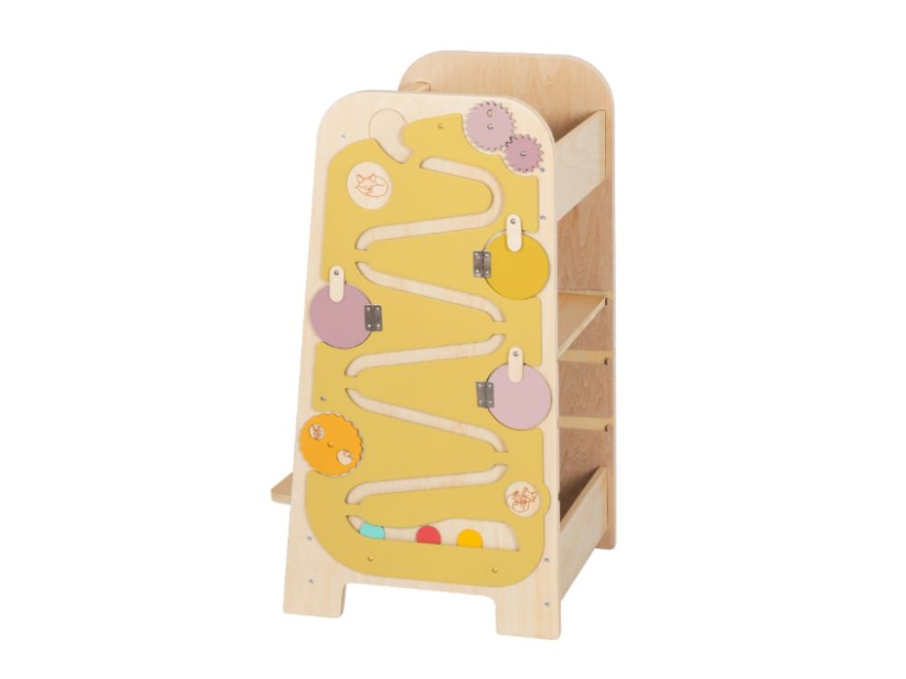 Panoul de activități de pe o parte a turnului de învățare conține mai multe surprize în spatele ușilor rotunde închise, imagini frumoase, roți dințate și o pistă pentru bile foarte lungă. Cealaltă parte a turnului de învățare este o tablă mare de desen pe care copiii pot scrie și desena cu cretă.
