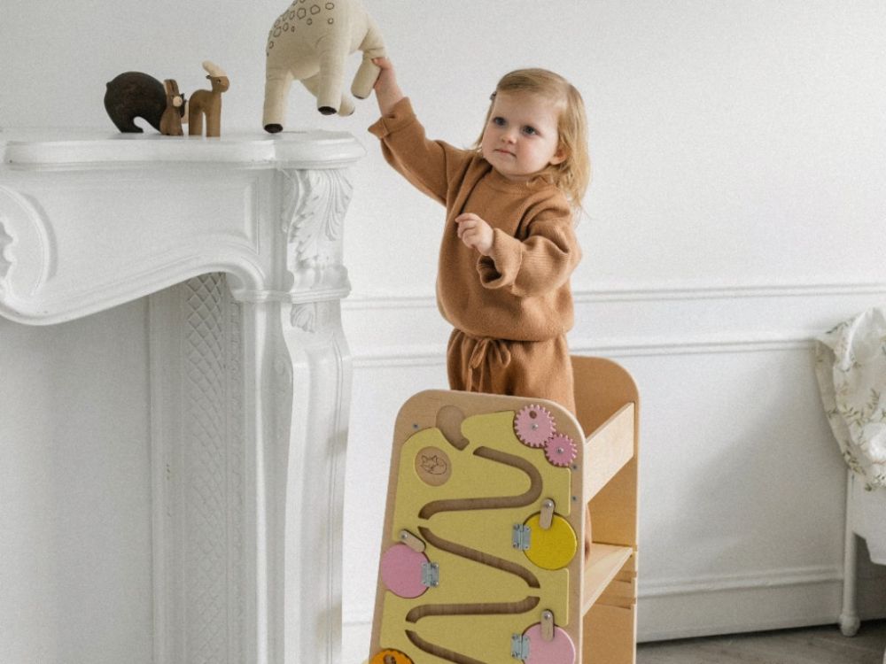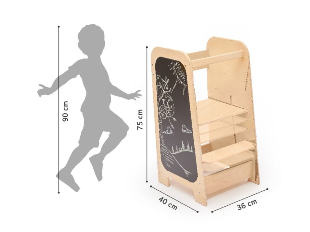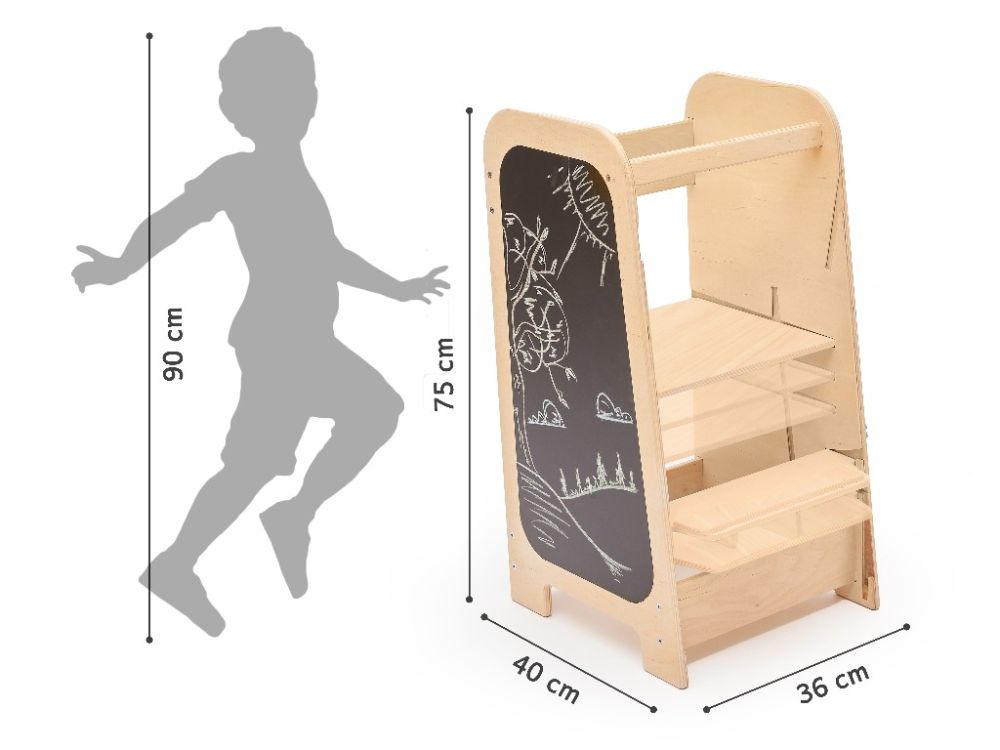 Turnul de învățare îi conduce pe copii spre independență. Cu turnul de învățare în creștere, pot ajunge la cartea sau jucăria preferată din camera lor, pot lua o periuță de dinți și să se spele pe mâini la chiuvetă, își pot umple cana preferată cu apă la chiuvetă sau pot spăla un măr pentru gustare.