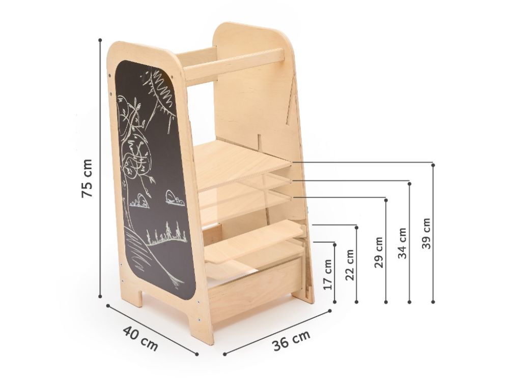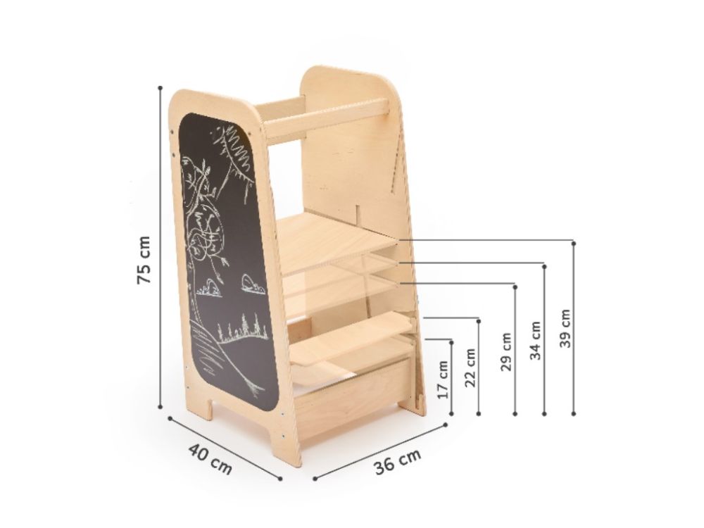 Rezistența și stabilitatea turnului de învățare sunt asigurate de materialul de înaltă calitate din care este fabricat turnul multifuncțional, precum și de elementele de fixare. Găurile pre-găurite permit ajustarea în înălțime nu doar a platformei, ci și a treptei. Turnul de învățare în creștere se adaptează perfect fiecărui copil.